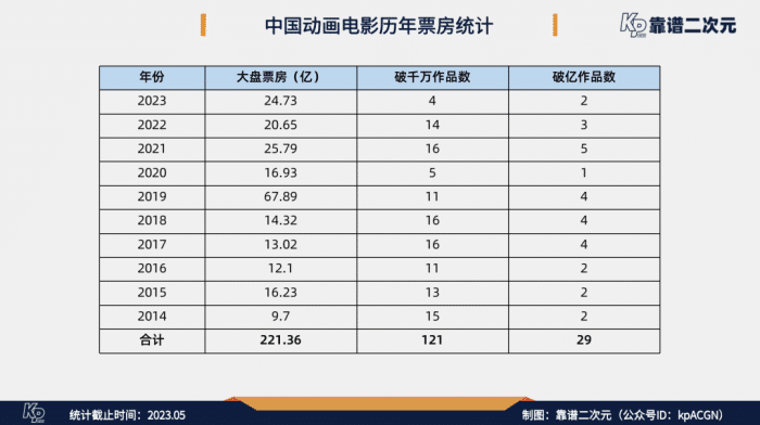那么,时至2023年,中国动画电影还值得期待吗?在得出结论之前,靠谱二次元盘点了2014年-2023年5月近10年共计121部票房破千万的中国动画电影,试图从中观察产业的发展规律,也期望通过结合市场现状和产业从业经验,分析当下中国动画电影的困境与机遇。