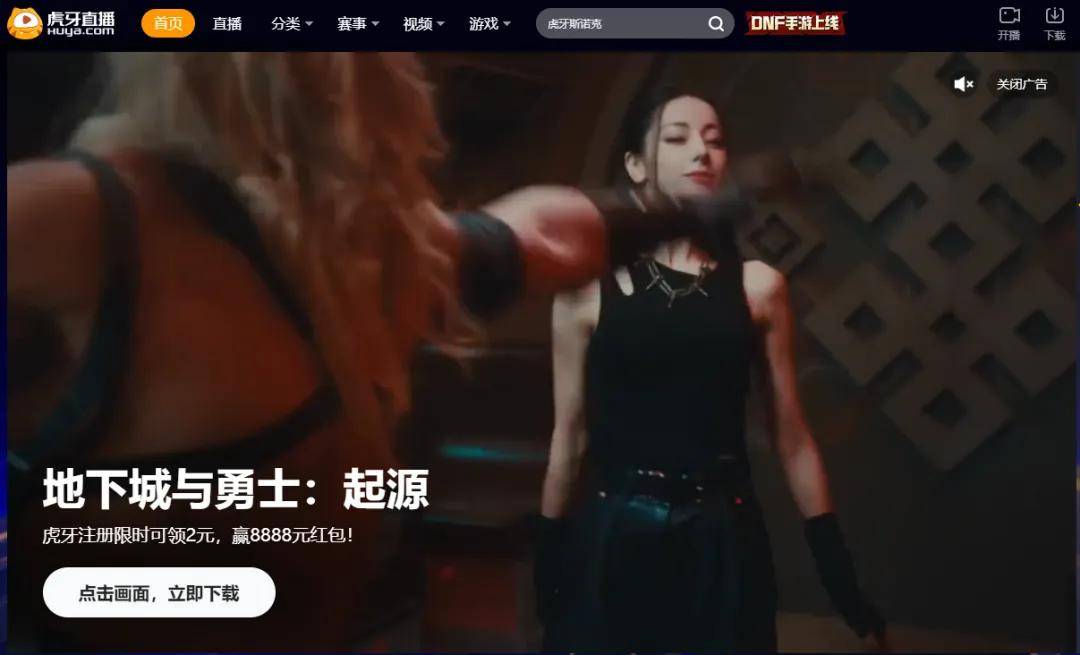 虎牙直播首页目前仍然是《DNF手游》的广告